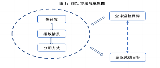 SBTi方法框架包括三个关键要素:碳预算、排放情景和分配方式。SBTi基本逻辑是在不超过与全球温控目标有关的温室气体预算下,基于一系列有代表性的、科学的排放情景,按照合适的分配方式把企业排放路径与全球排放路径挂钩,将全球温控目标转变为对企业的切实要求。见图1所示。